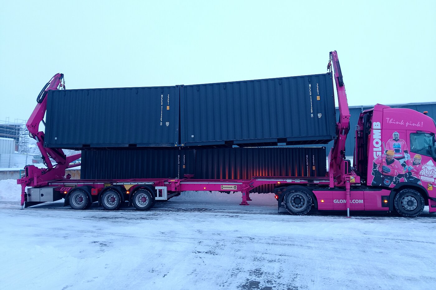 Zum Einsatz kam unser großer Hammar Megareach Seitenlader, mit dem auch das sichere Stapeln von Containern problemlos möglich ist.